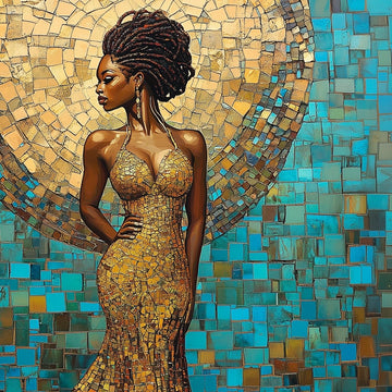 This captivating digital artwork features a powerful mosaic portrait of a Black woman, exquisitely adorned...