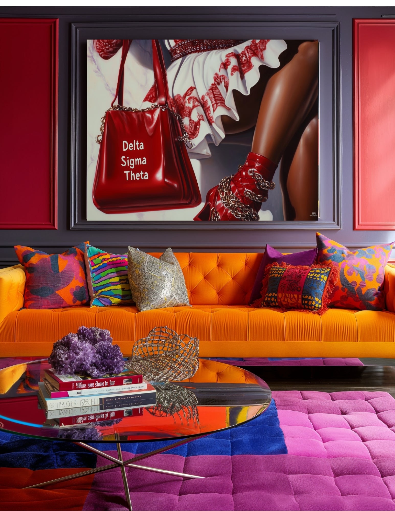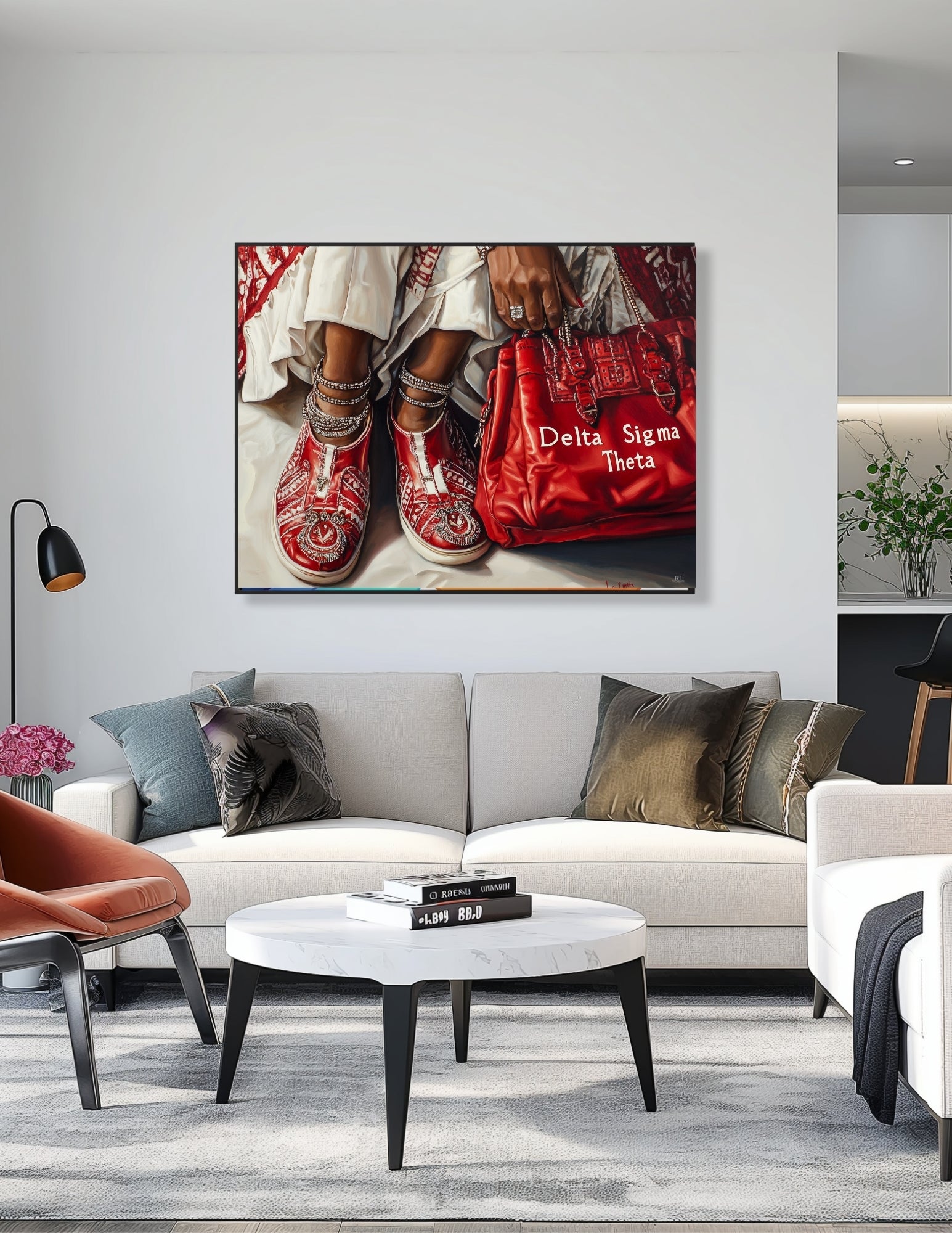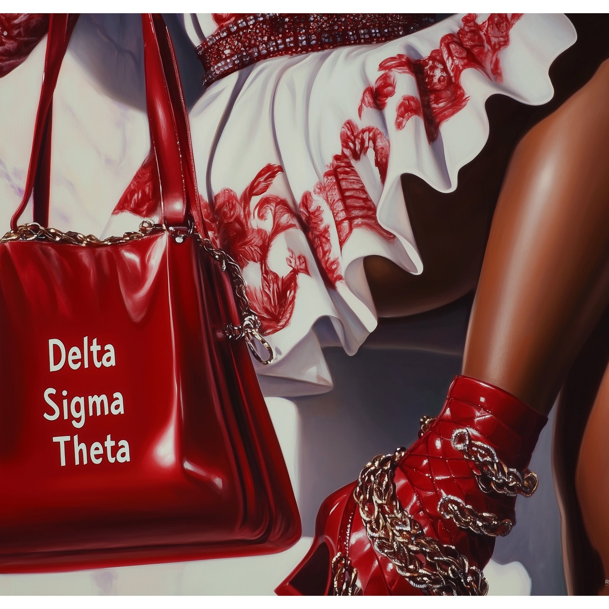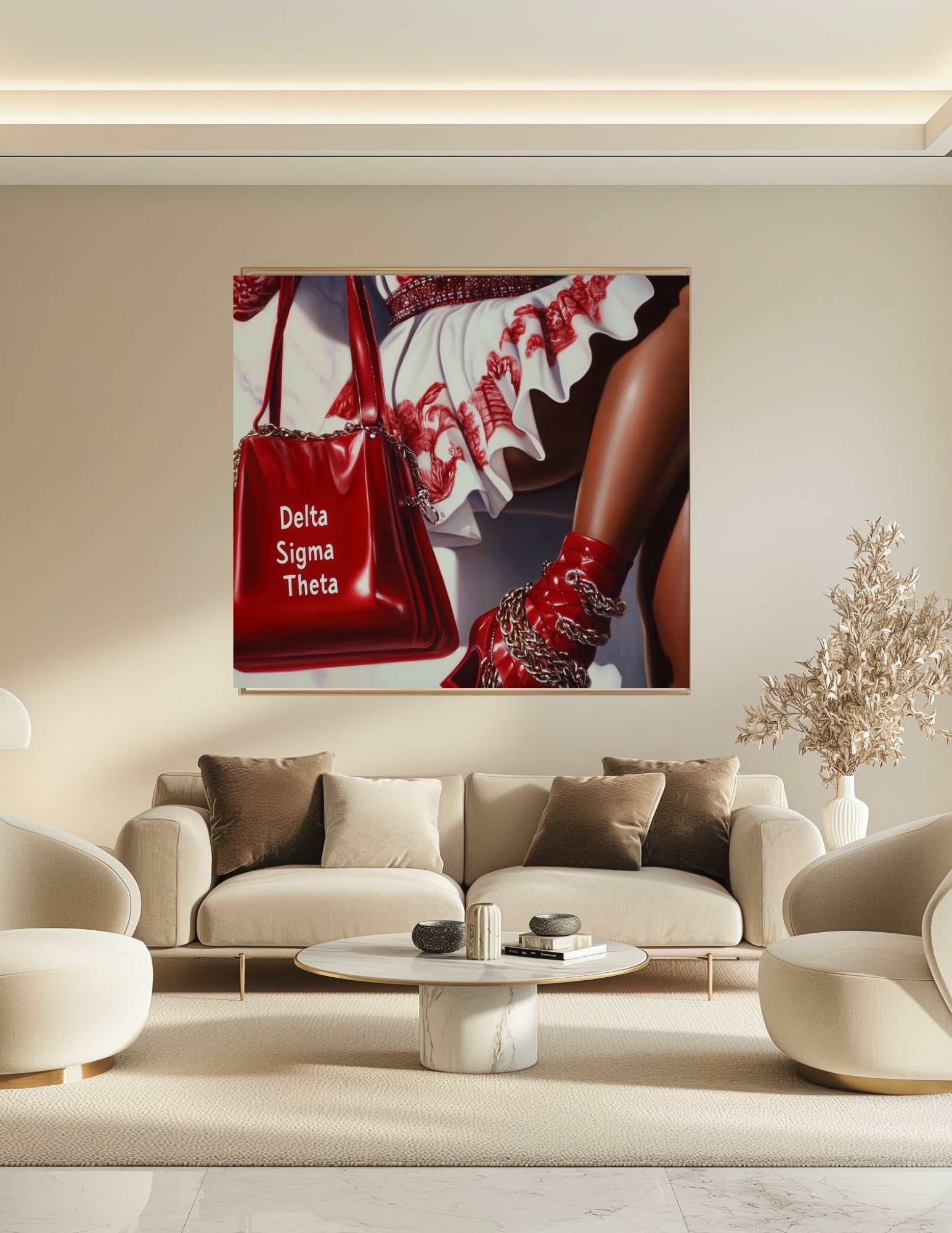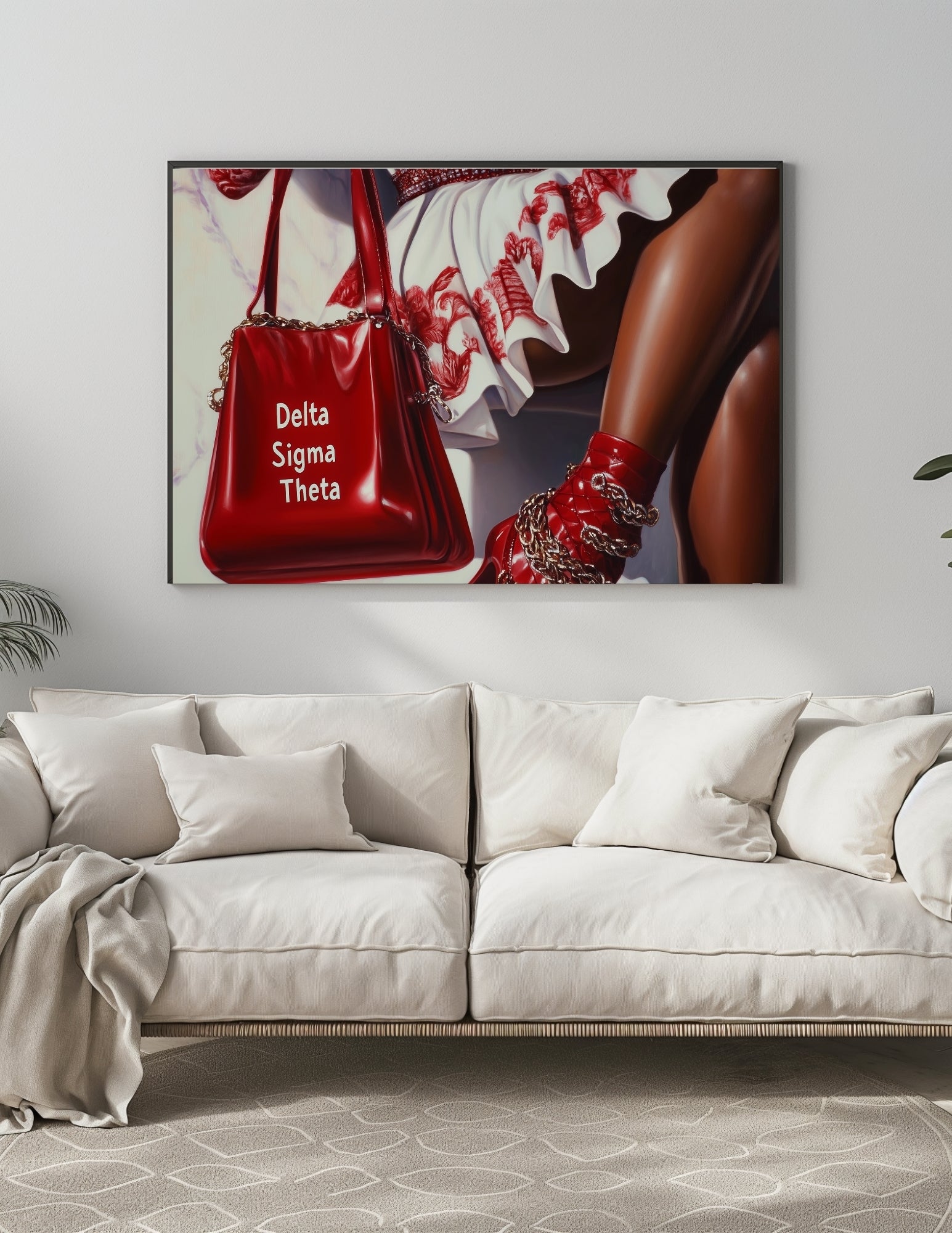 Elevate your collection with this captivating digital art print, showcasing the essence of Delta Sigma Theta Sorority, Inc. The artwork features a sophisticated woman adorned in a detailed red and white floral dress, paired with bold red high-heeled boots wrapped in gold chains for a touch of chic elegance. A glossy red "Delta Sigma Theta" handbag with a stylish chain accent complements the ensemble, adding a distinctive flair. This print is perfect for Delta sorors and art enthusiasts who want to display their pride and appreciation for the sorority’s legacy. Ideal for printing, framing, or incorporating into digital designs, it brings the spirit of Delta to life in a modern, artistic fashion.